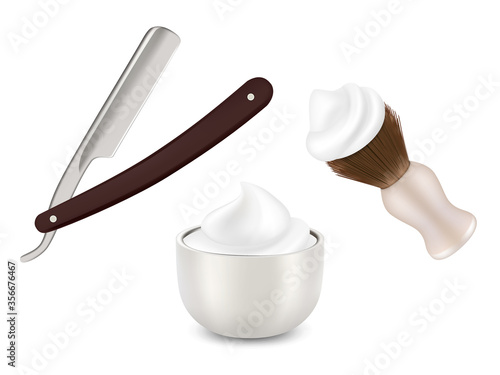 Vector realistic illustration of mug with shaving foam, shaving brush and straight barber razor isolated on white background.