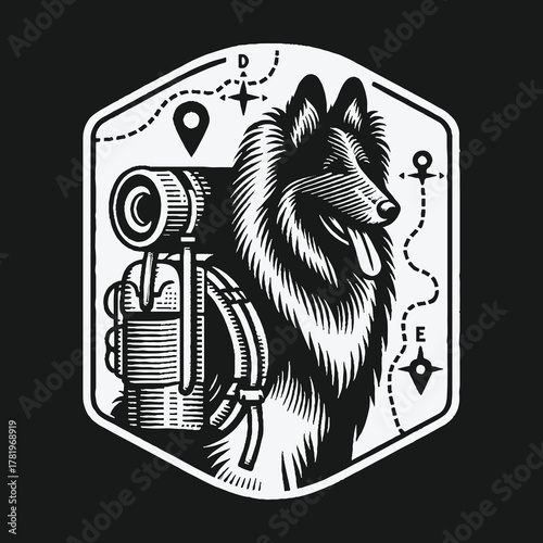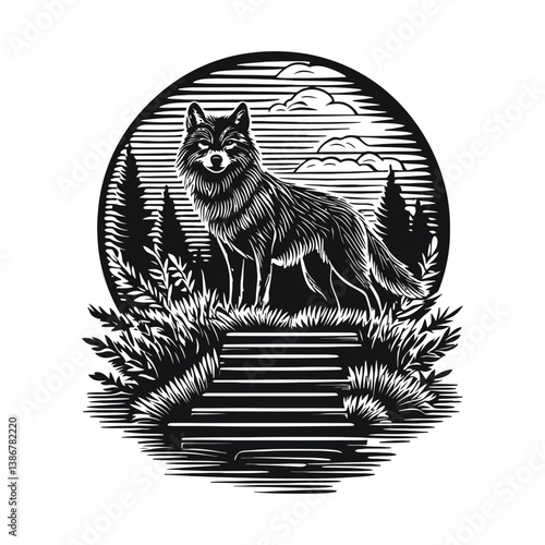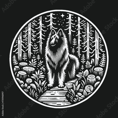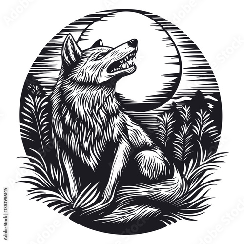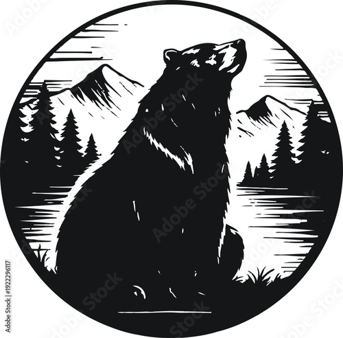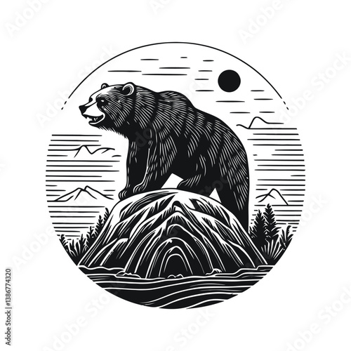 Vector animal tattoo or t-shirt print design. Bear head combined with nature in round frame with moon phases.