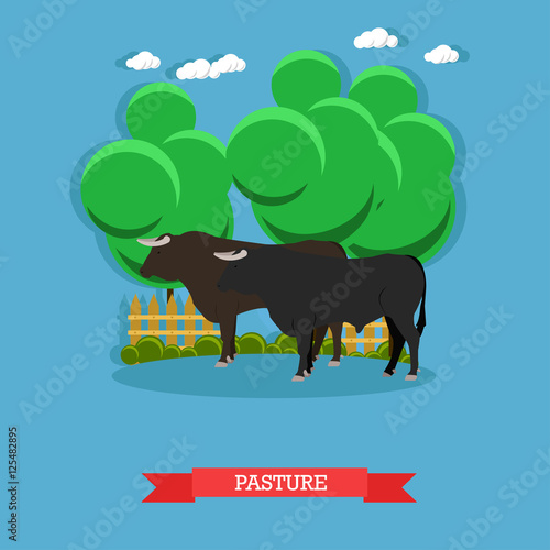 Vector concept poster of beef farm. Grazing cattle on a pasture.