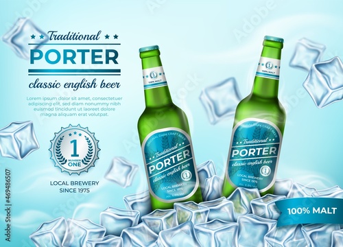 Vector realistic dark craft beer alcoholic drink brand glass bottle and glass of beer on blue sparkling background. Craft bottled beer advertisement design template.