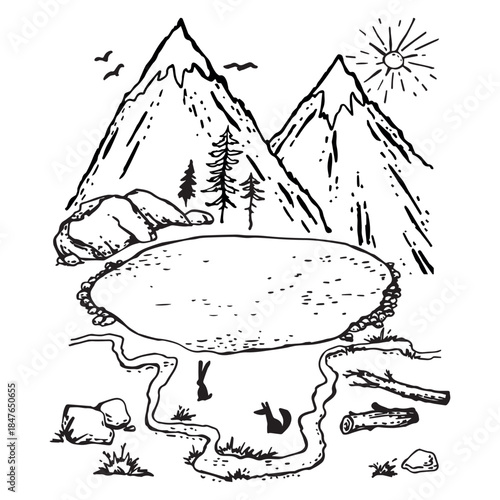 Tiger tattoo art style. Vector geometric tattoo sketch. Vintage hand drawn tiger, mountains, forest, compass star, crossed arrows.