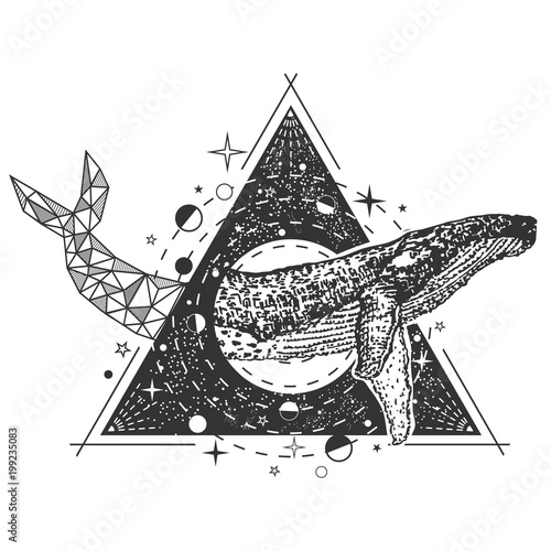 Whale tattoo art style. Vector geometric tattoo sketch. Vintage hand drawn ocean whale, symbol of good luck, awareness and wisdom.