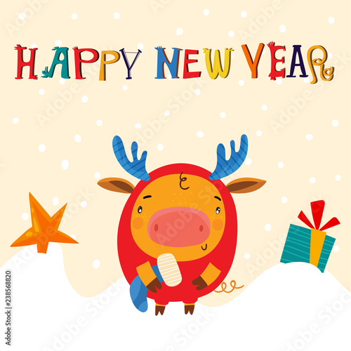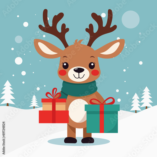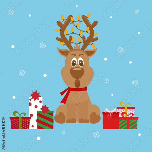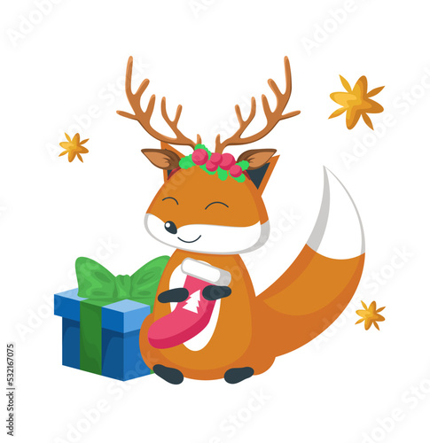 Vector cute Christmas fox animal cartoon illustration. Winter holiday happy character card design for xmas and new year greeting. Doodle character wearing reindeer horns and mistletoe headband