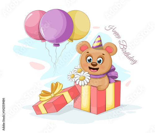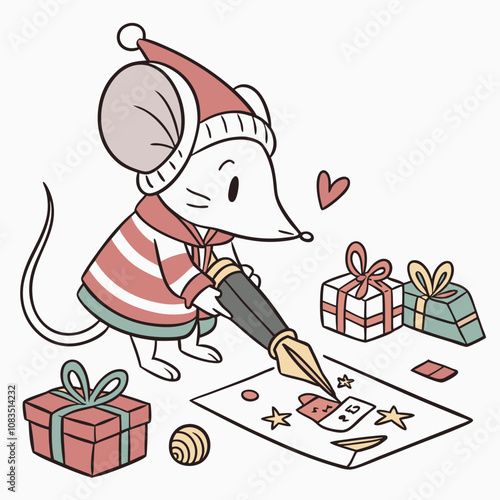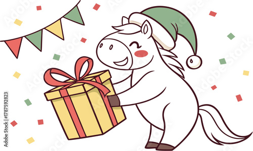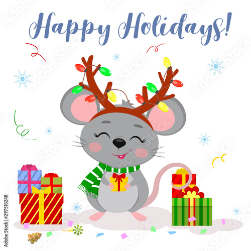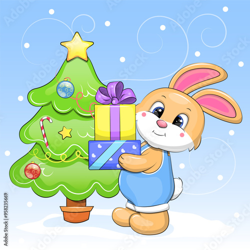 Vector cute Christmas rabbit. Cartoon card with happy winter character. Happy holiday celebration. Xmas and new year greeting postcard. Doodle hare in garland standing near gift box