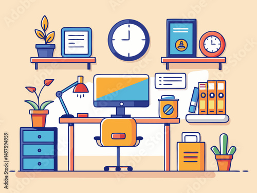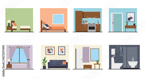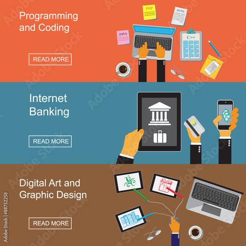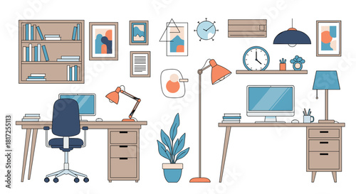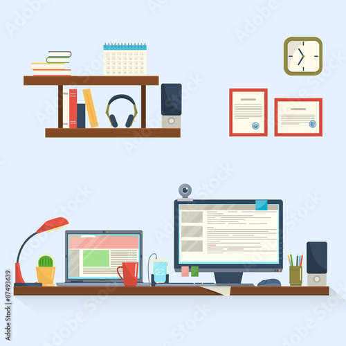 Vector design concept for working places. Set of office desks and spaces, programmer and developer, copywriter, designer. Office interior and icons in flat style.