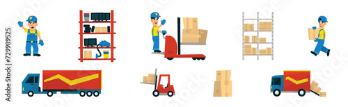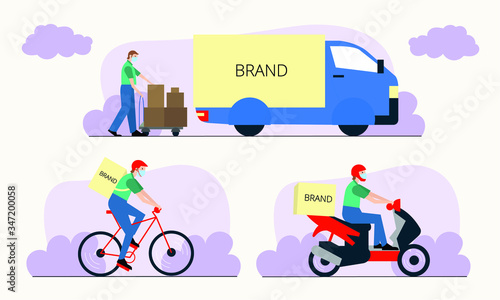 Vector icons set of food delivery profession people isolated on white background. Couriers delivering food by foot, by bicycle, truck and by scooter flat style design elements.