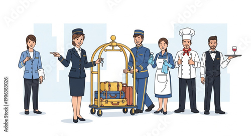 Restaurant people vector illustration. Manager, chef, cook, waiter, confectioner and guests man and woman with wineglasses flat style cartoon characters isolated on white background.