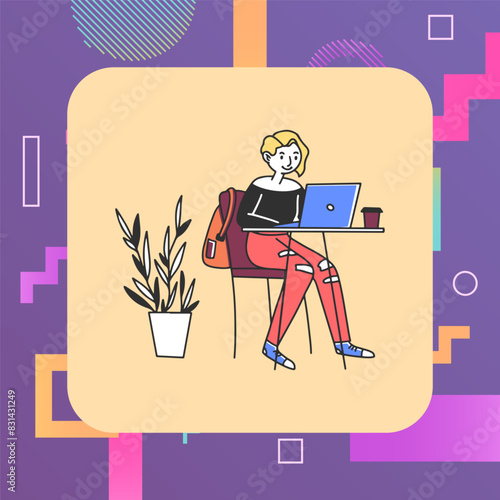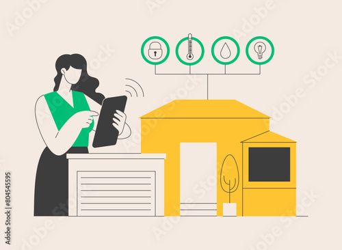 Vector illustration of cleaning woman or housewife listening to radio while washing flooring with sponge mop. Radio station concept design element in flat style.