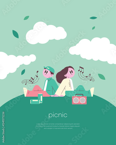 Vector illustration of happy loving couple having got a date. Sweethearts walking in the park flat style design element.