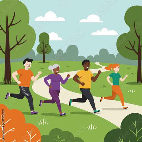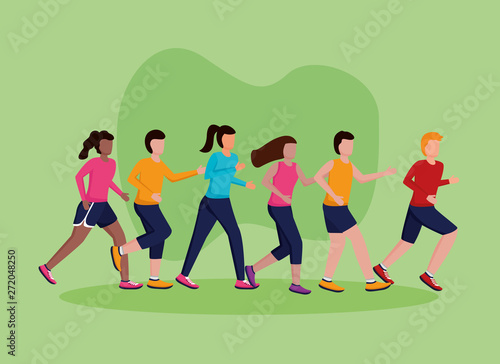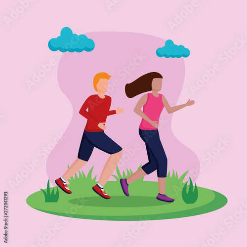 Vector illustration of happy loving couple running towards each other. Meeting of lovers in the park flat style design element.