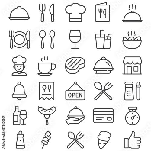 Vector seamless pattern with decorative restaurant service, food, tableware symbols, icons. Restaurant background, wrapping paper texture thin line art flat style design.