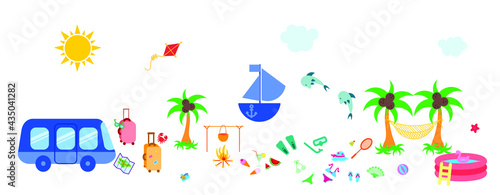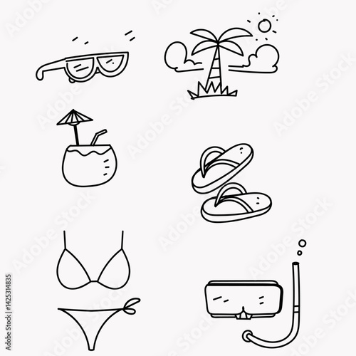 Vector seamless pattern with decorative summer symbols, icons. Summer background, wrapping paper texture thin line art flat style design.
