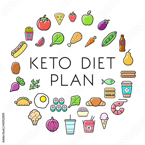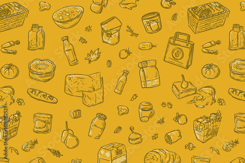 Vector food and drink icon set and seamless pattern with vegetables, meat, fish, cheese, milk, oil bottle, mushrooms and eggs. Healthy eating concept hand drawn illustration.
