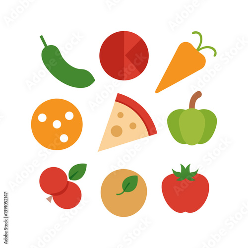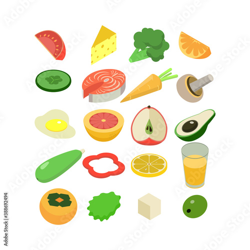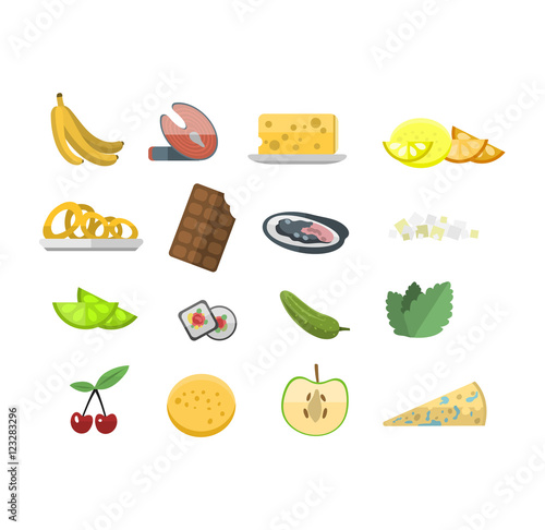 Vector food set. Meal and drink for lunch icon. Fast food and healthy menu with fruit and vegetables for diet breakfast illustration. Shopping trolley cart for grocery order, purchase and delivery