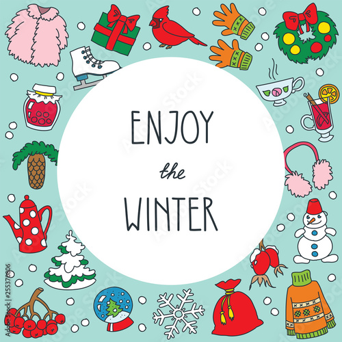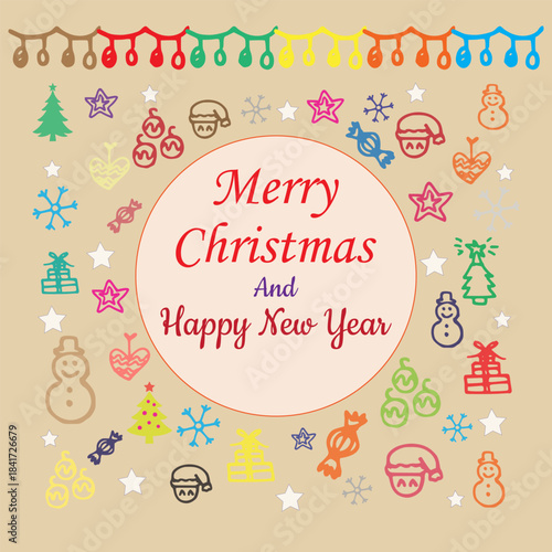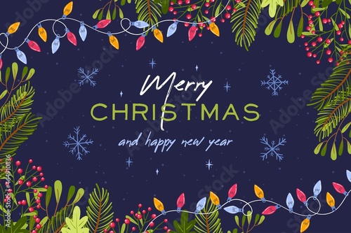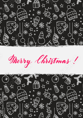 Vector Holidays seamless pattern with reindeers, gifts, snowmen, holly berries, balls, snowflakes, lettering. Decorative festive design element for Christmas greeting card, invitation, wrapping paper.