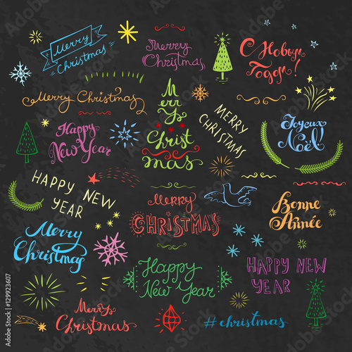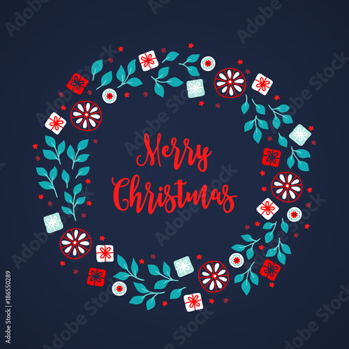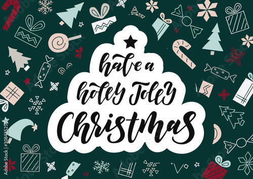 Vector Holidays seamless pattern with candy canes, gifts, fir-trees, snowflakes, lettering. Decorative festive design element for Christmas greeting card, invitation, wrapping paper.