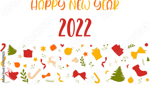 Vector Holidays seamless pattern with santa hats, gifts, fir-trees, snowflakes, balls, stars, lettering. Decorative festive design element for Christmas greeting card, invitation, wrapping paper.