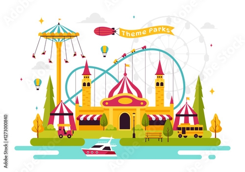 Vector illustration of amusement park concept design element with ferris wheel attraction, ice cream and coffee stalls, salesgirls and buyers, walking people. Cartoon characters, flat style.