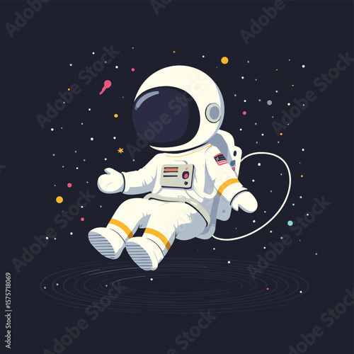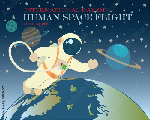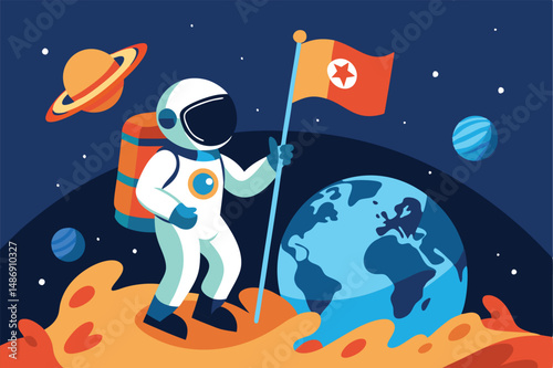 Vector illustration of flying astronaut in outer space, planet Earth and Moon. Man in spacesuit and helmet. Space exploration concept design element in flat style.