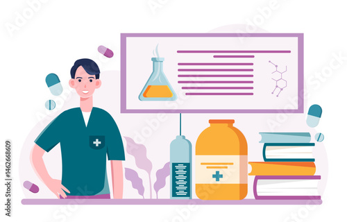 Biological research concept vector illustration in flat style. Biological laboratory interior. Biologist woman is working with laboratory glassware and equipment.