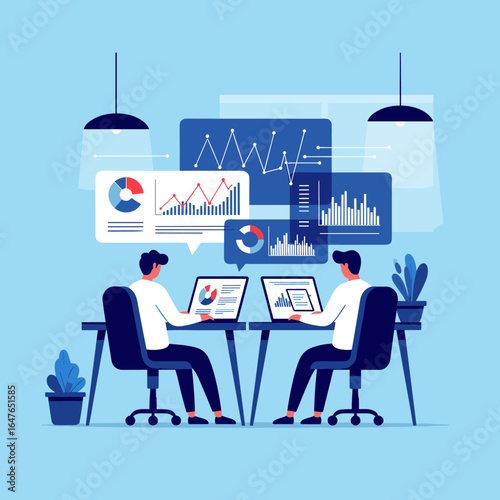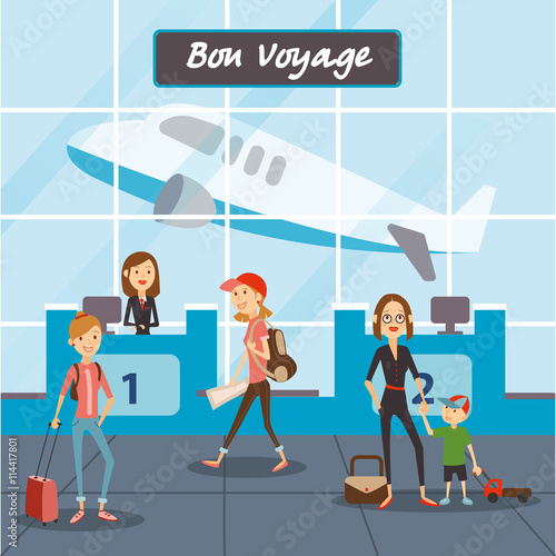 Vector illustration of business people at the airport. Businessmen with tablet, laptop sitting in waiting hall. Business trip, travel by plane concept design element in flat style.