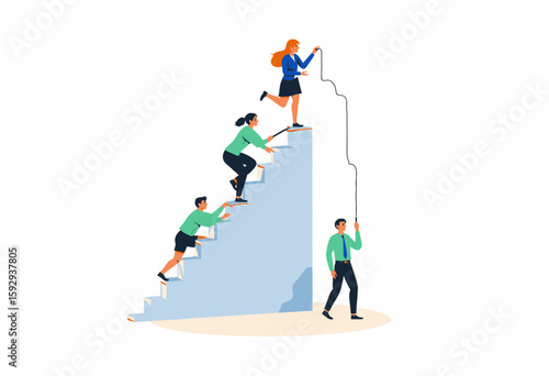 Vector illustration of businessman overcoming challenges and finding exit from labyrinth. Man keeping the flag flying high. Business strategy, success concept flat style design.