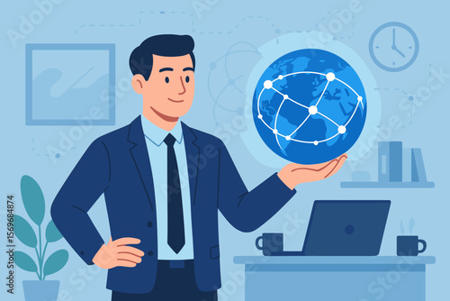 Vector illustration of businessman on human hand holding the Earth like greek mythology god Titan Atlas holds the world on his shoulders. Business concept design element in flat style.