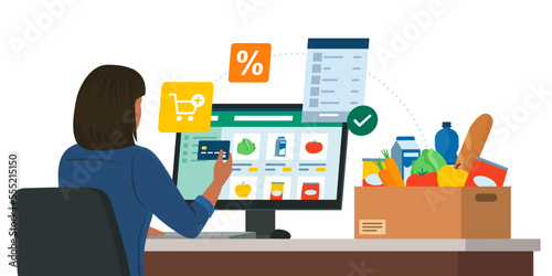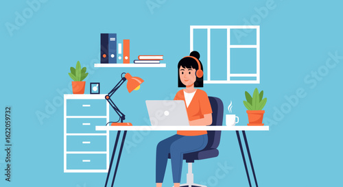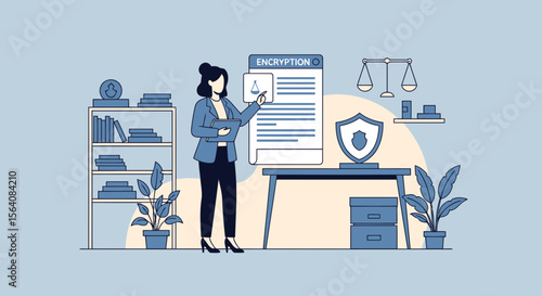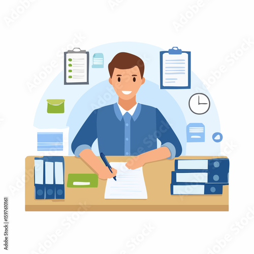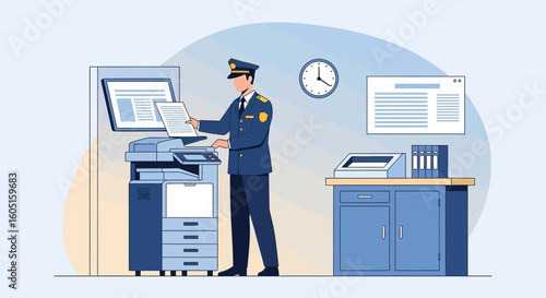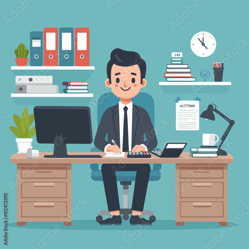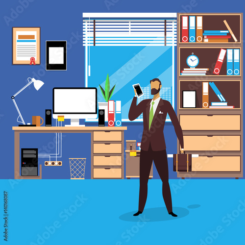 Vector illustration of businessman with briefcase using smartphone. Modern office workspace interior. Flat style design.