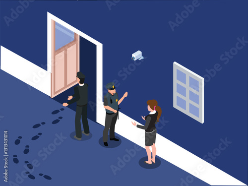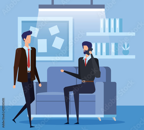 Vector illustration of two businessmen standing at open door. One man is going away. Business meeting concept design element.