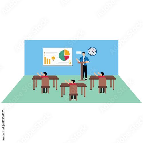 Vector illustration of choir with conductor performing on stage of concert hall with accompaniment of piano and saxophone. Flat style design.