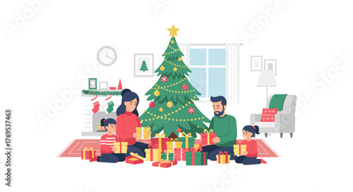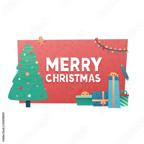 Vector illustration of christmas tree decorated with baubles, lights. Gifts under the tree. Cat touching tree with paw. Home interior. Merry Christmas and Happy New Year design element in flat style