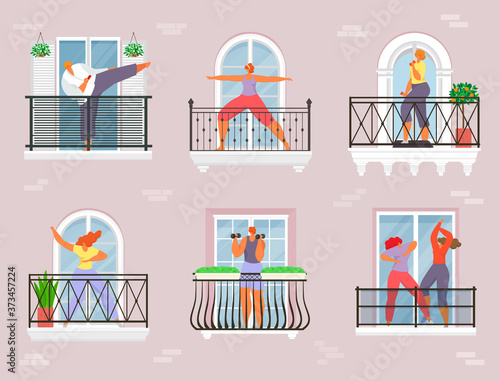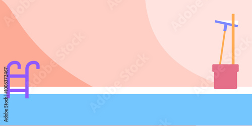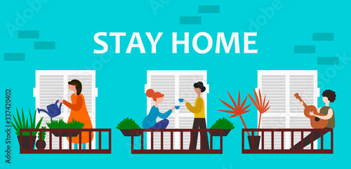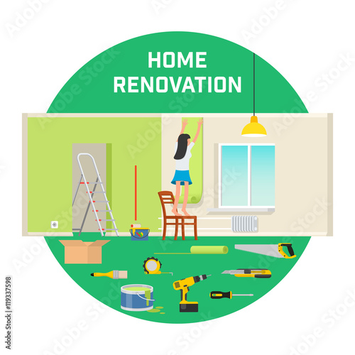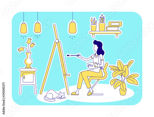 Vector illustration of mother and little son in kitchen. Woman is cooking, little boy is sitting at the table in baby chair. Housewife concept design element in flat style.