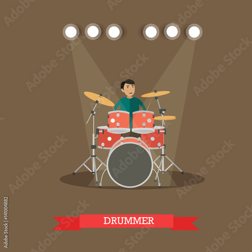 Vector illustration of young man playing drums. Drummer flat style design element.
