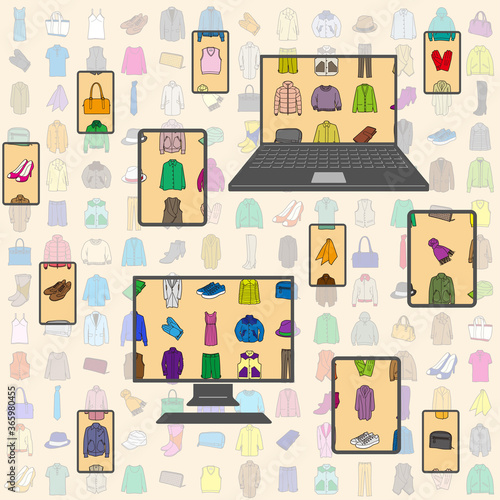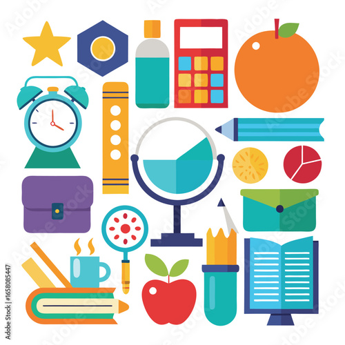 Vector illustration of electric juicer and glass of orange, watermelon, kiwi, peach, lemon, garnet juice with slices of fruits. Flat style design.