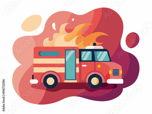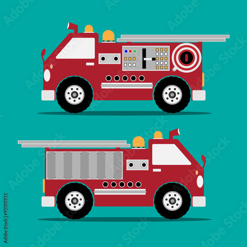 Vector illustration of fire engine. Fire truck and firefighter in fire protection suit and helmet design element in flat style.