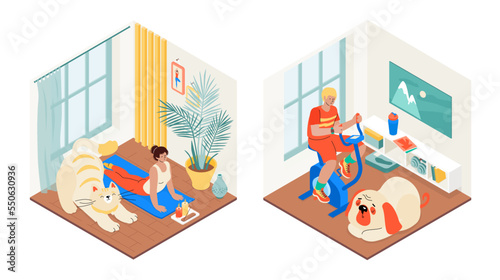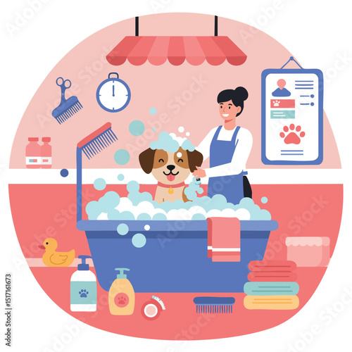 Vector illustration of little girl sitting on carpet and playing with her dog in children room. Pet animal. Nursery interior and cartoon characters in flat design.