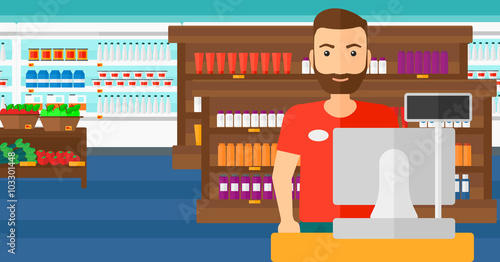 Vector illustration of musician young man playing electric guitar. Guitarist and electric string musical instrument flat style design.