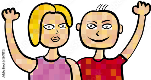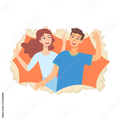 Vector illustration of happy couple in retro pop art comic style. Man showing thumb up hand sign.