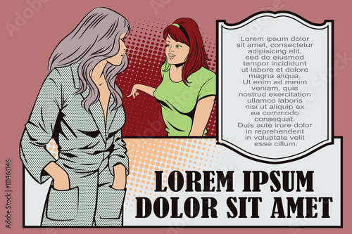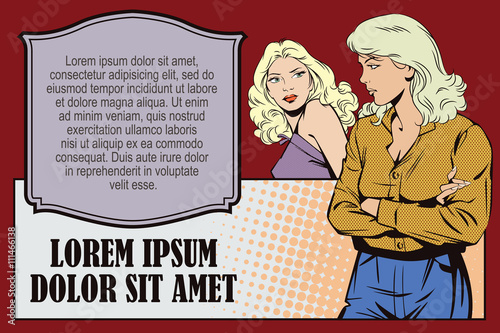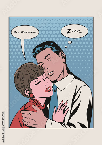 Vector illustration of happy couple with bags in retro pop art comic style. Man and woman looking at each other. Black friday lettering. Shopping concept design element.
