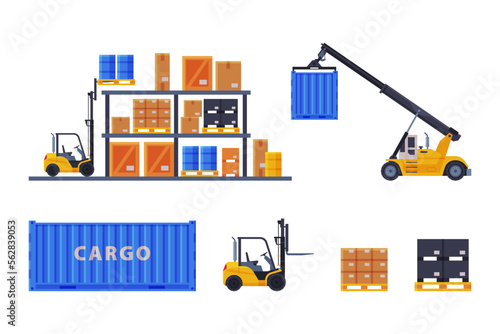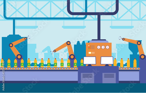 Vector illustration of industrial robot for palletizing food products. Cardboard boxes on pallet, conveyor belt. Factory automation concept design element in flat style.