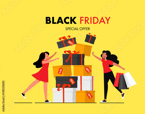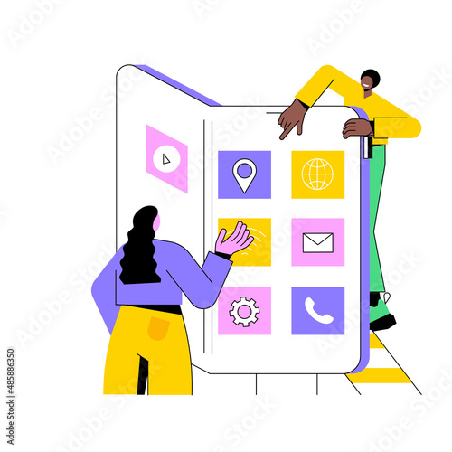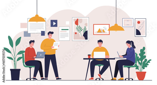 Fast food concept vector illustration in flat style. Man serving visitors young man and woman. Fast food restaurant interior.