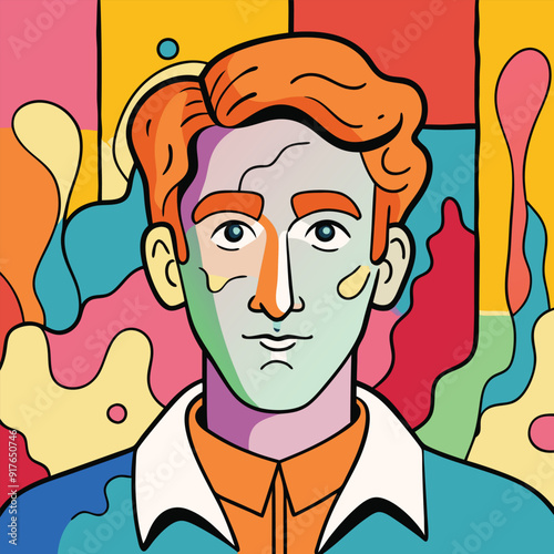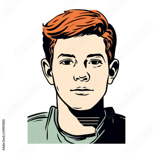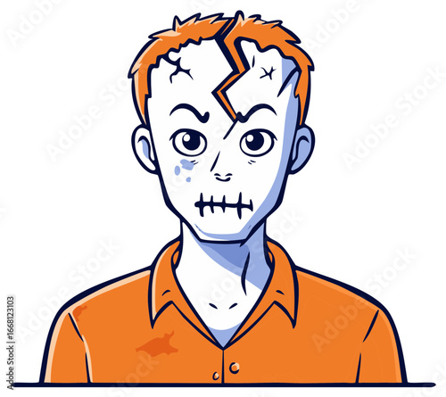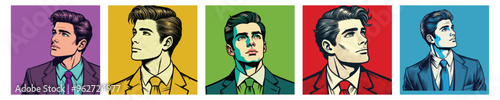 Vector illustration of man with cogwheels on right part of his face in retro pop art comic style. Calm, unemotional face.