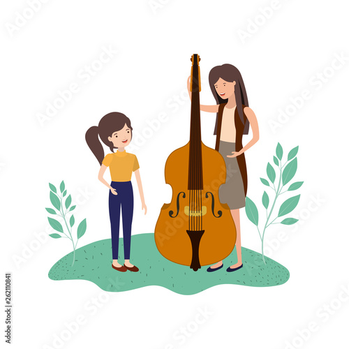 Vector illustration of musician female playing contrabass string musical instrument. Flat style design element.