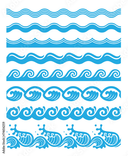 Vector illustration of ocean and sea waves, surfs and splashes. Seamless isolated design elements on white background. Blue marine patterns.