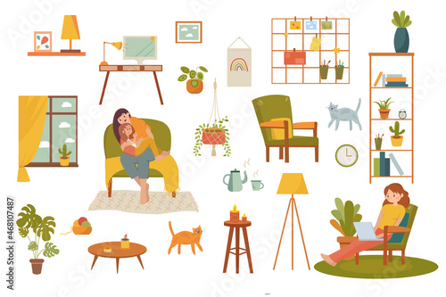 Vector illustration of parents sitting in armchairs. Man is reading newspaper, woman is knitting. Living room interior. Family concept design element in flat style.