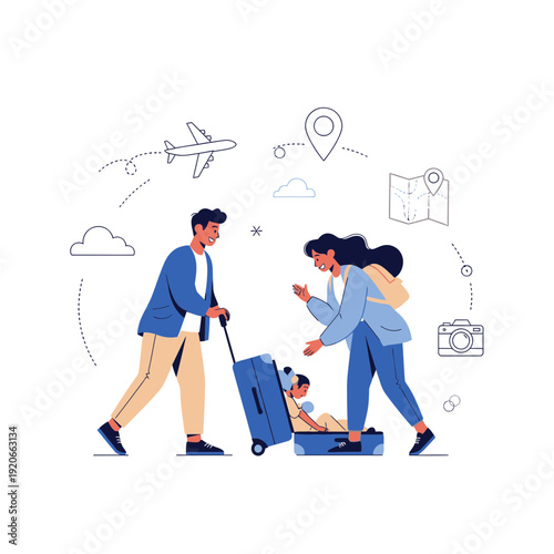 Vector illustration of pilot and stewardess with luggage. Airline staff, cabin crew flat style design element, icon isolated on white background.