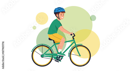 Vector illustration of mailman riding bicycle and delivering mail. Cheerful smiling mail carrier with post bag. Mail delivery service. Postman design element in flat style.