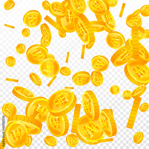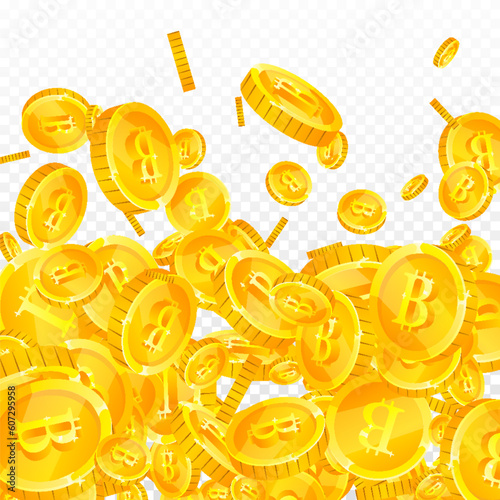 Vector illustration of realistic 3d golden coins with dollar sign. Falling gold coins isolated on white background.