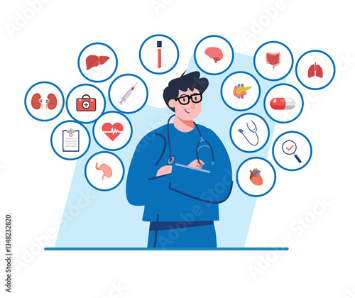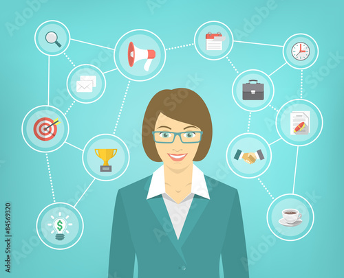 Vector illustration of researcher woman and archaeological articles around her. Archaeology concept infographic items, icon in flat style.