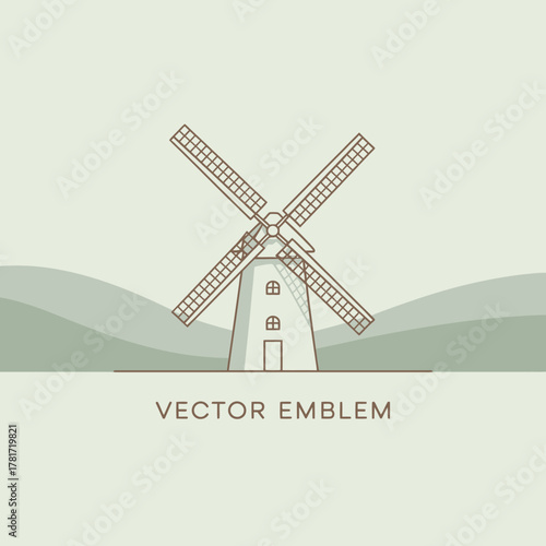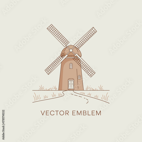 Vector illustration of retro windmill used to grind corn into flour. Farming concept design element in flat style.